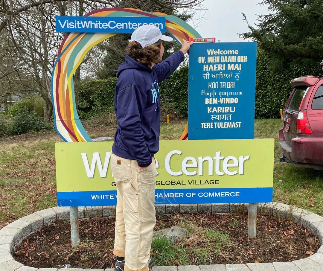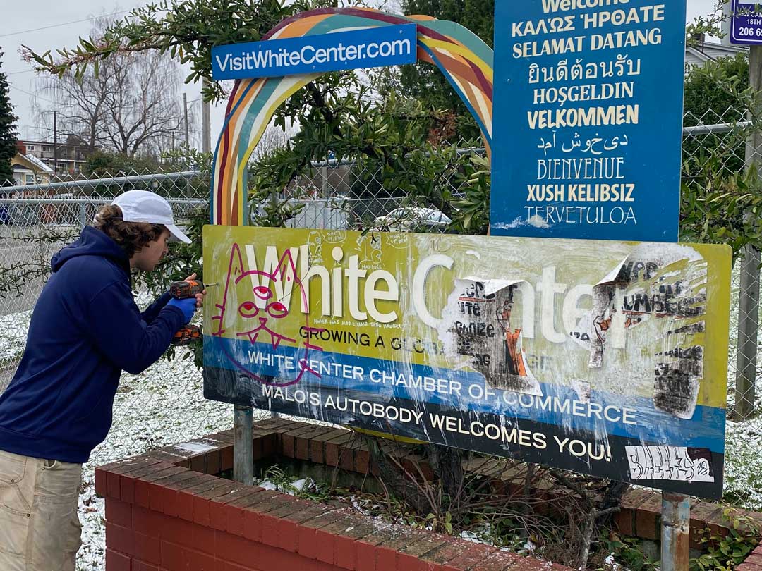 The Scouts replaced the damaged sign at 18th Ave SW and Delridge, and also cleaned and re-installed the White Center Rainbow and Welcome in 10 languages portions of the sign at 4th Ave and SW 108th Street that had been stolen.