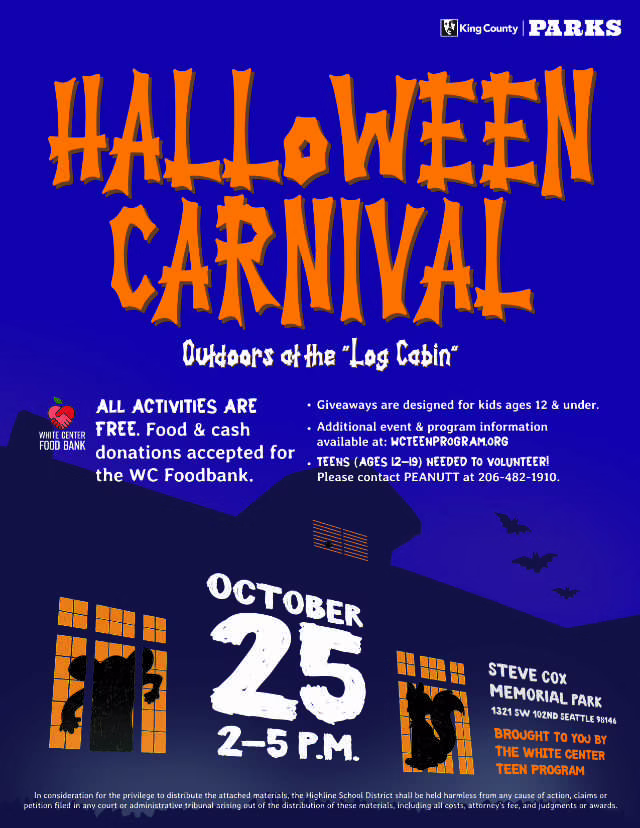 “The White Center Teen Program is thrilled to welcome families back to Steve Cox Memorial Park for our Annual Halloween Carnival,” organizers said.