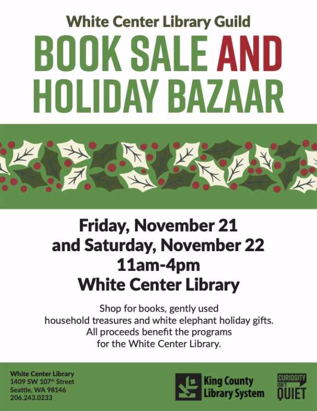 The White Center Library Guild will host a two-day Book Sale and Holiday Bazaar Friday, Nov. 21 and Saturday, Nov. 22, from 11 a.m. to 4 p.m. at the White Center Library.