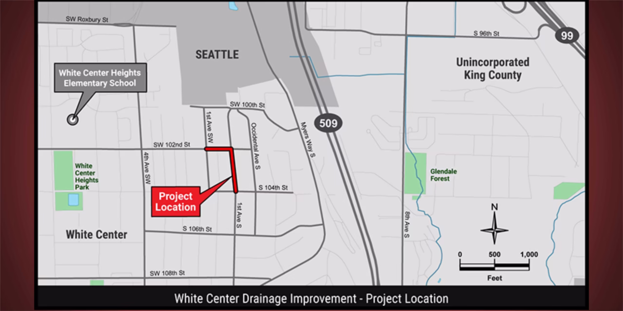 The drainage improvements are part of a broader effort by King County to manage stormwater, reduce pollution and protect public health and the environment in urban areas like White Center.
